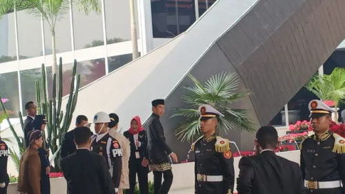 Jokowi tiba di Kompleks Parlemen sekitar pukul 08.57 WIB. Ia didampingi istrinya Iriana Jokowi yang mengenakan kebaya berwarna coklat.