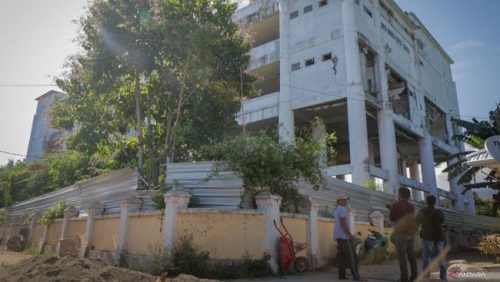 Bangunan bertingkat tiga itu masih menyisakan bekas keganasan gempa 2018. Beberapa pilar gedung yang menjulang tinggi terlihat retak dan menampilkan jeroannya, begitu pula dengan dindingnya.
