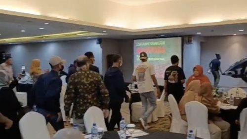 Diskusi yang dihadiri sejumlah tokoh, mulai dari Refly Harun, Marwan Batubara, Said Didu, Din Syamsudin, dan sejumlah tokoh lain itu tiba-tiba didatangi massa. Bahkan sekelompok orang telah hadir di lokasi dan melakukan orasi di depan hotel sebelum acara dimulai.