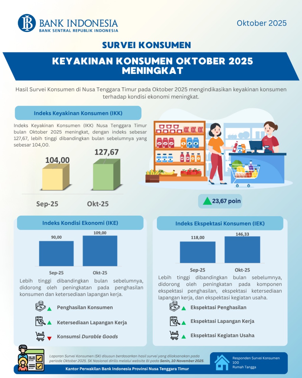 Indeks Keyakinan Konsumen (IKK) NTT tercatat sebesar 127,67, naik dari 104 pada September 2025. Angka ini menunjukkan masyarakat masih berada di level optimis (indeks >100). Kenaikan ini sejalan dengan IKK nasional yang juga meningkat menjadi 121,2 dari 115 bulan sebelumnya.
