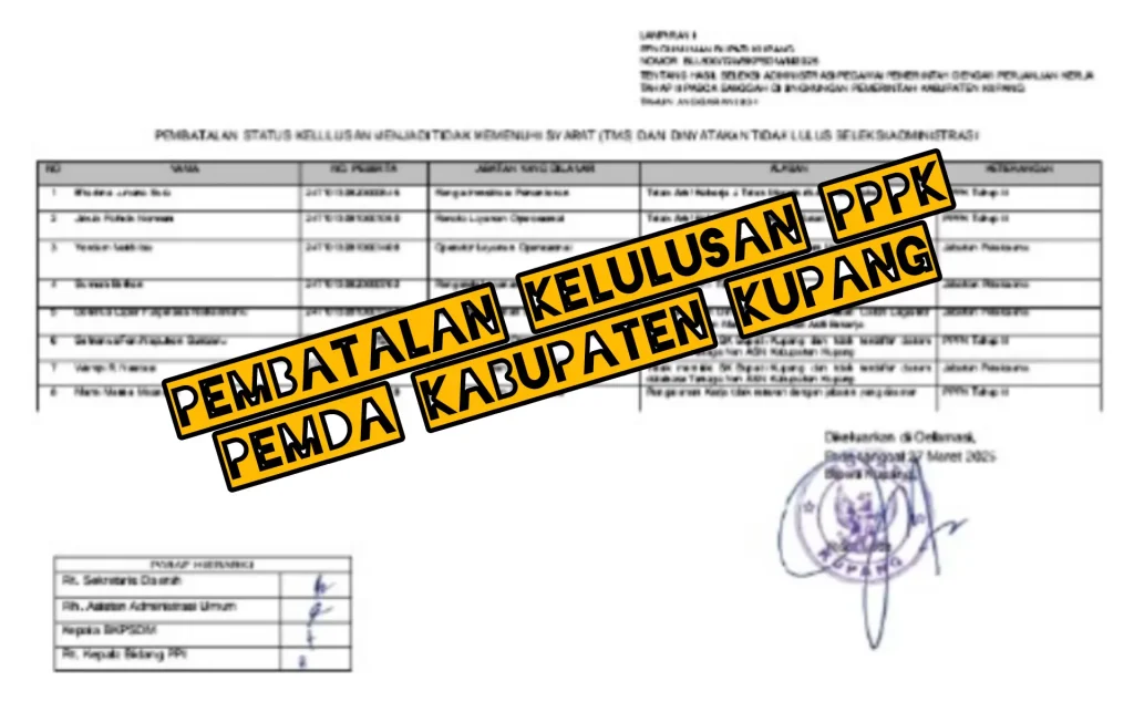 Suara Kupang – Delapan Peserta seleksi PPPK Tahap II Tahun 2024 di batalkan Kelulusan oleh Pemerintahan Kabupaten Kupang. Pengumuman pembatalan kelulusan delapan peserta seleksi PPPK Tahap II Tahun 2024 disampaikan oleh Pemerintah Kabupaten Kupang melalui Badan Kepegawaian dan Pengembangan Sumber Daya Manusia (BKPSDM). Keputusan ini dikeluarkan berdasarkan Surat Pengumuman Nomor: BU.800/728/BKPSDM/III/2025 tentang Hasil Seleksi Administrasi PPPK Tahap II Pasca Sanggah di Lingkungan […]